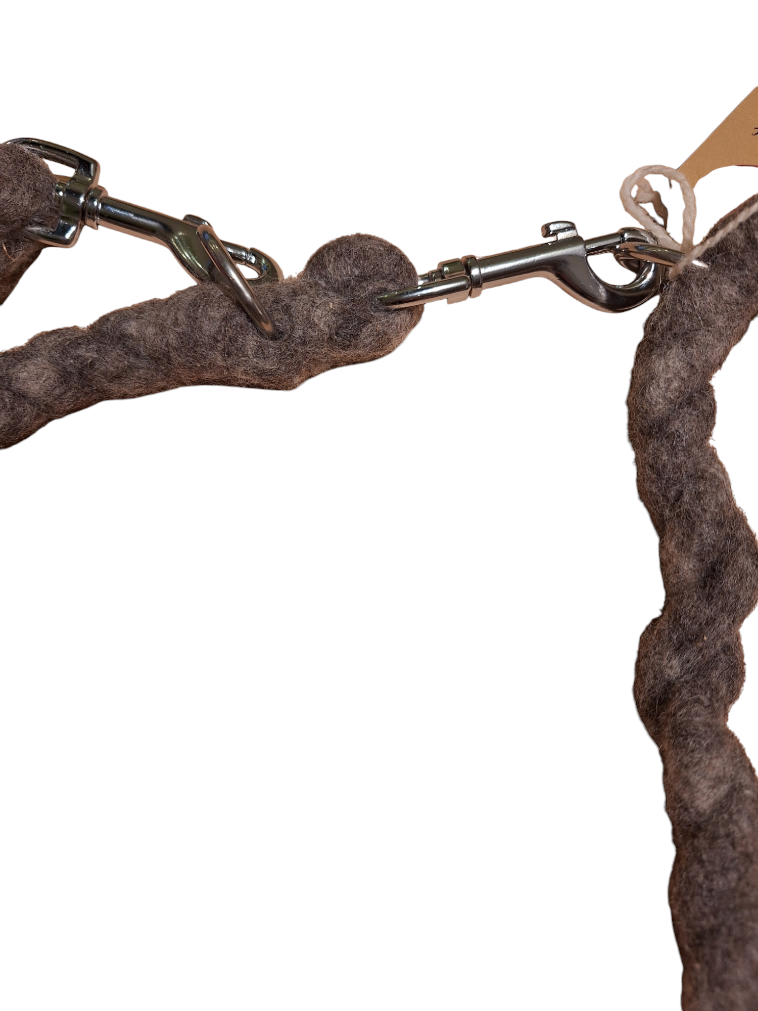 Die Wolle kann bis zu 30% ihres Eigengewichts an Wasser aufnehmen, ohne sich feucht anzufühlen. Somit ist die Leine auch auf einem Regenspaziergang ein guter Begleiter, der angenehm in der Hand liegt.